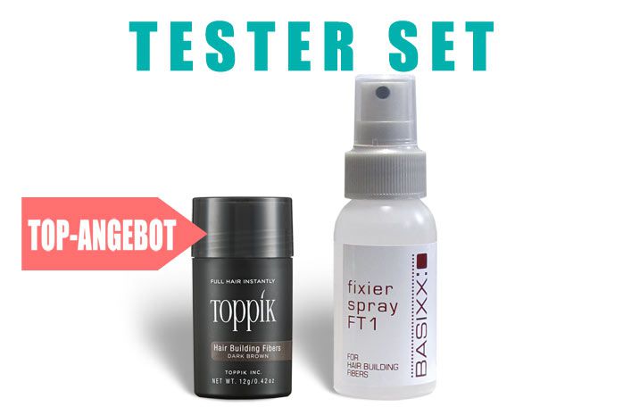 Starten Sie noch heute Ihr Aussehen zu verändern. Als TOPPIK Tester, Beginner oder Einsteiger erhalten Sie bei uns das professionelle 12 gr. TOPPIK Test-Set in einer Zusammenstellung mit BASIXX FIxierspray 50ml, welches Sie in unserem Shop zu einem absoluten TOP-Preis kaufen können.
